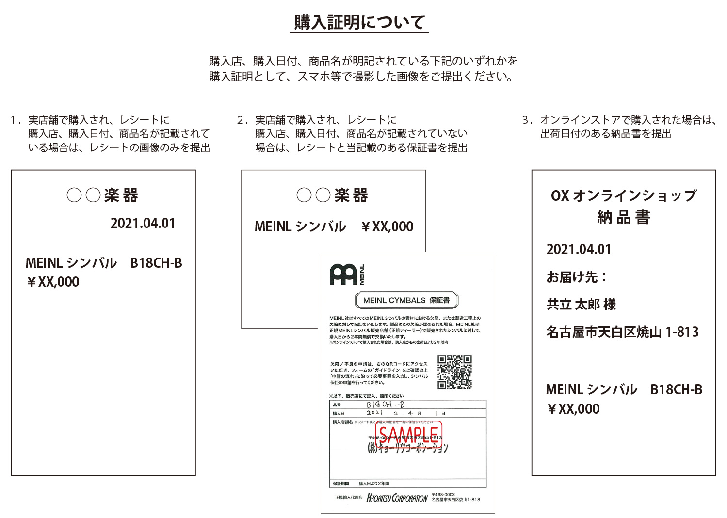 1:購入証明書: ①レシート、②レシートに購入日、品番の記載がない場合、当記載のある保証書の画像、③オンラインストアで購入の場合は納品書のいずれか
